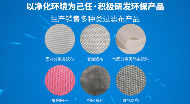 主要產品:主要產品有國際先進的德國多尼爾織機生產的滌綸濾布,丙綸濾布,單絲濾布,透氣層布,各種篩網,滌綸針刺氈,丙綸針刺氈,芳綸針刺氈,玻纖覆膜濾袋,聚酯網帶等產品,主要應用于制藥、化工、染料、鋼鐵、建筑、治鐵、化工、陶瓷、水泥、地質、礦產等行業。